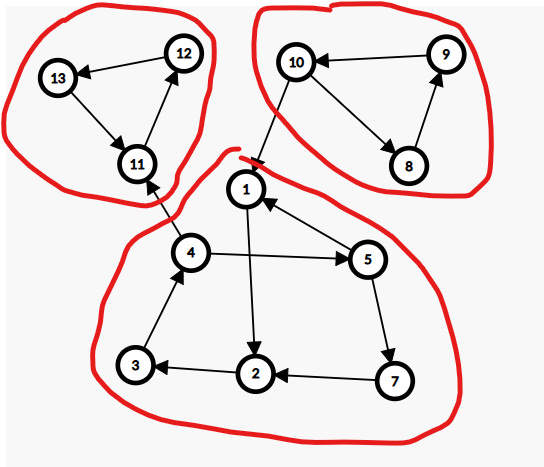 An important fact is that if we condense each SCC into a node and draw edges connected SCC’s, then the graph will form a directed acyclic graph. This is true because if there was indeed a cycle in the new graph, then it would form another SCC which contradicts the maximally sized condition.